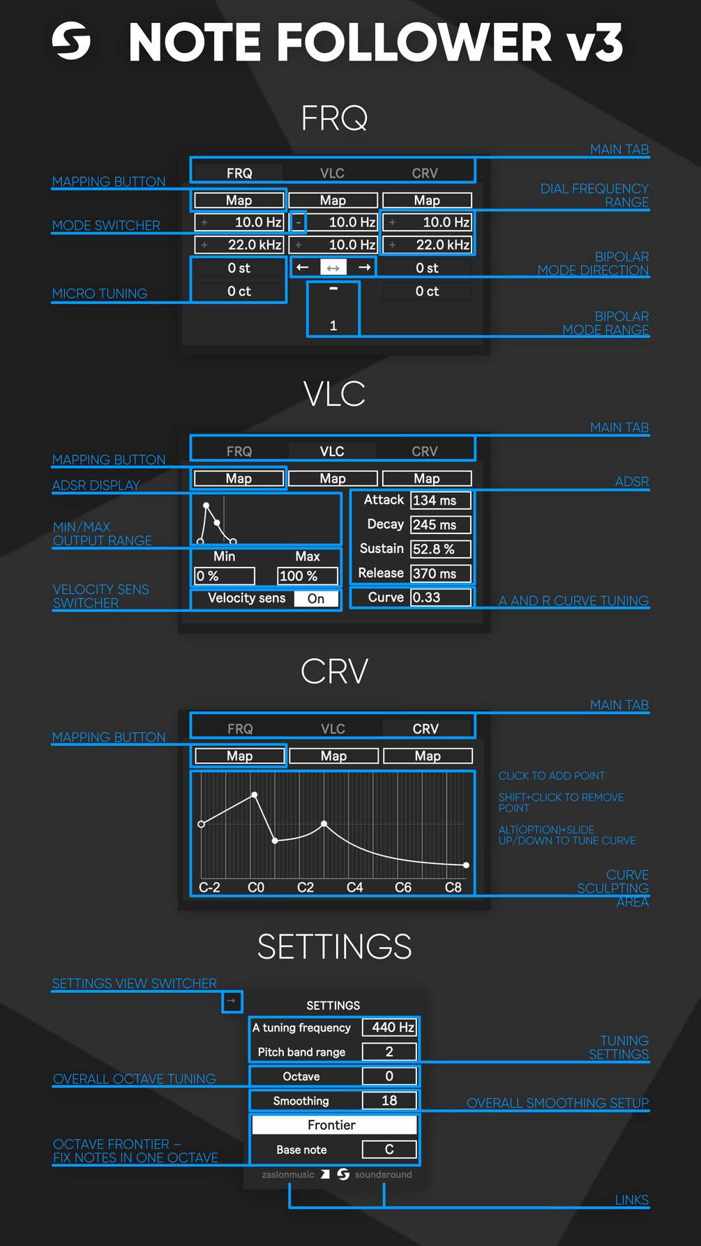 Note Follower 3.1 converts incoming notes into frequency automation and lets you map that automation to any device, even a VST plugins. You are able to set the boundaries of the filter frequencies so that it coincides with the boundaries of the device. Also, you can shift octave or smooth automation. Pitch bend is also could change the automation (choose the PB value of your synth). Version 2 now supports negative values for the frequency range (use + switcher) and velocity mapping.