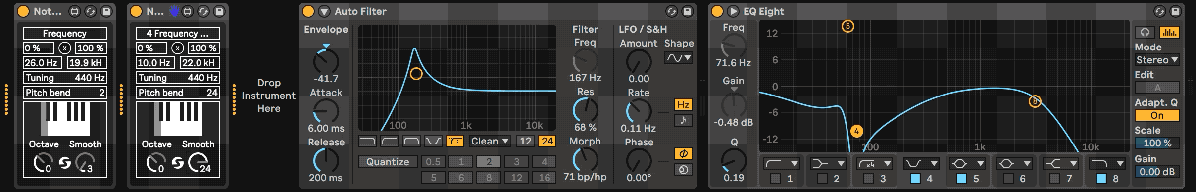 Note Follower 1.2 converts incoming notes into frequency automation and lets you map that automation to any device, even a VST plugins. You are able to set the boundaries of the filter frequencies so that it coincides with the boundaries of the device. Also, you can shift octave or smooth automation.